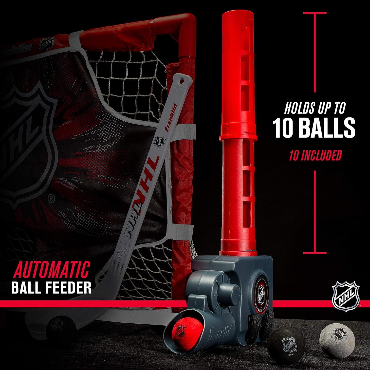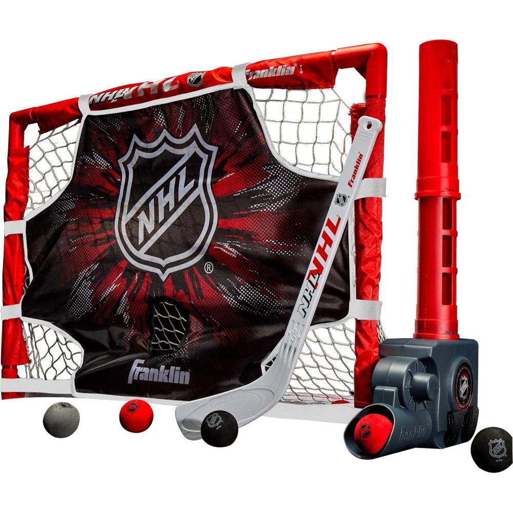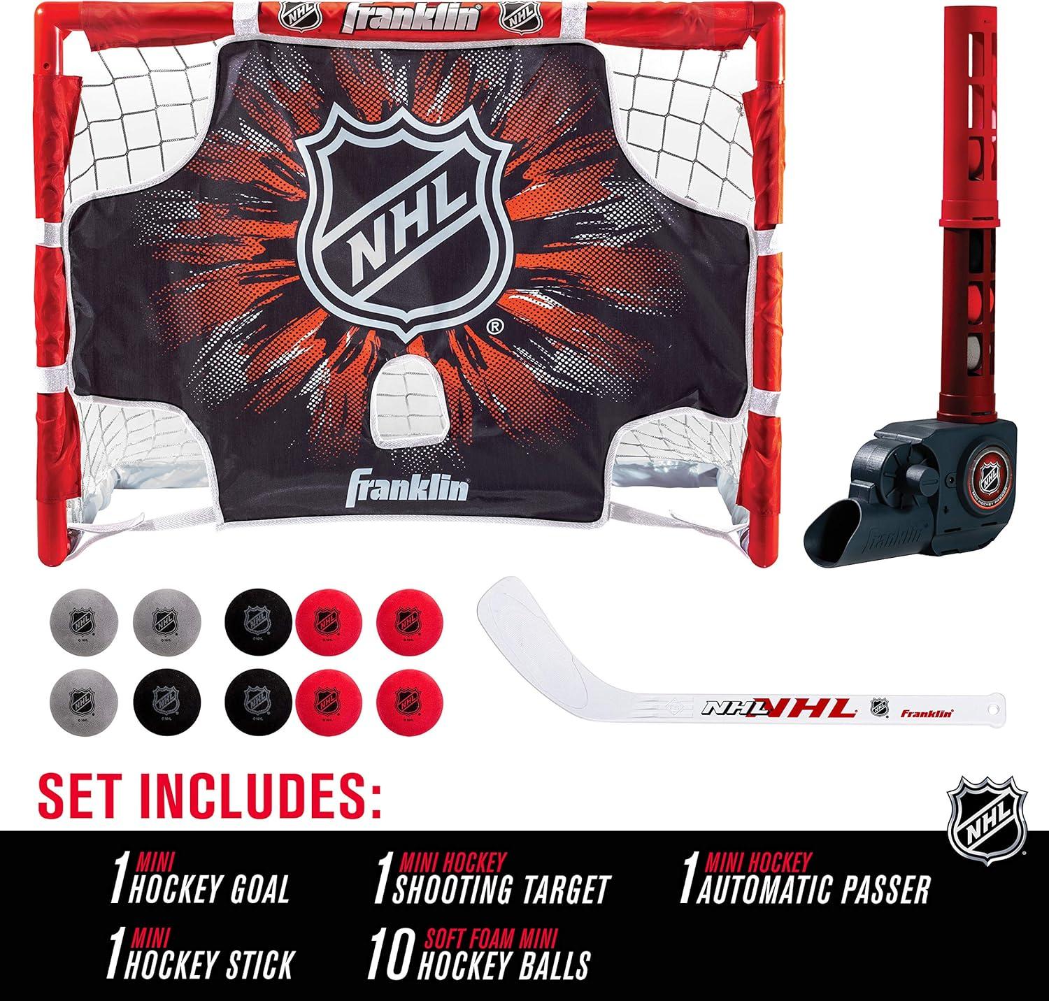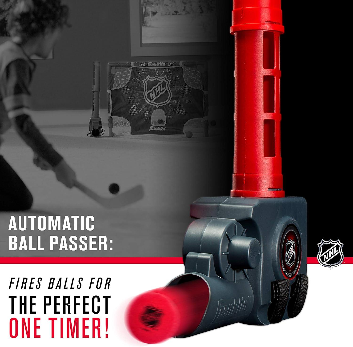 INCLUDES: an automatic mini hockey passer, 28″x 20″ mini hockey goal, target, a Mini hockey stick and (10) soft foam 2″ mini hockey balls [3 C batteries required but not included]