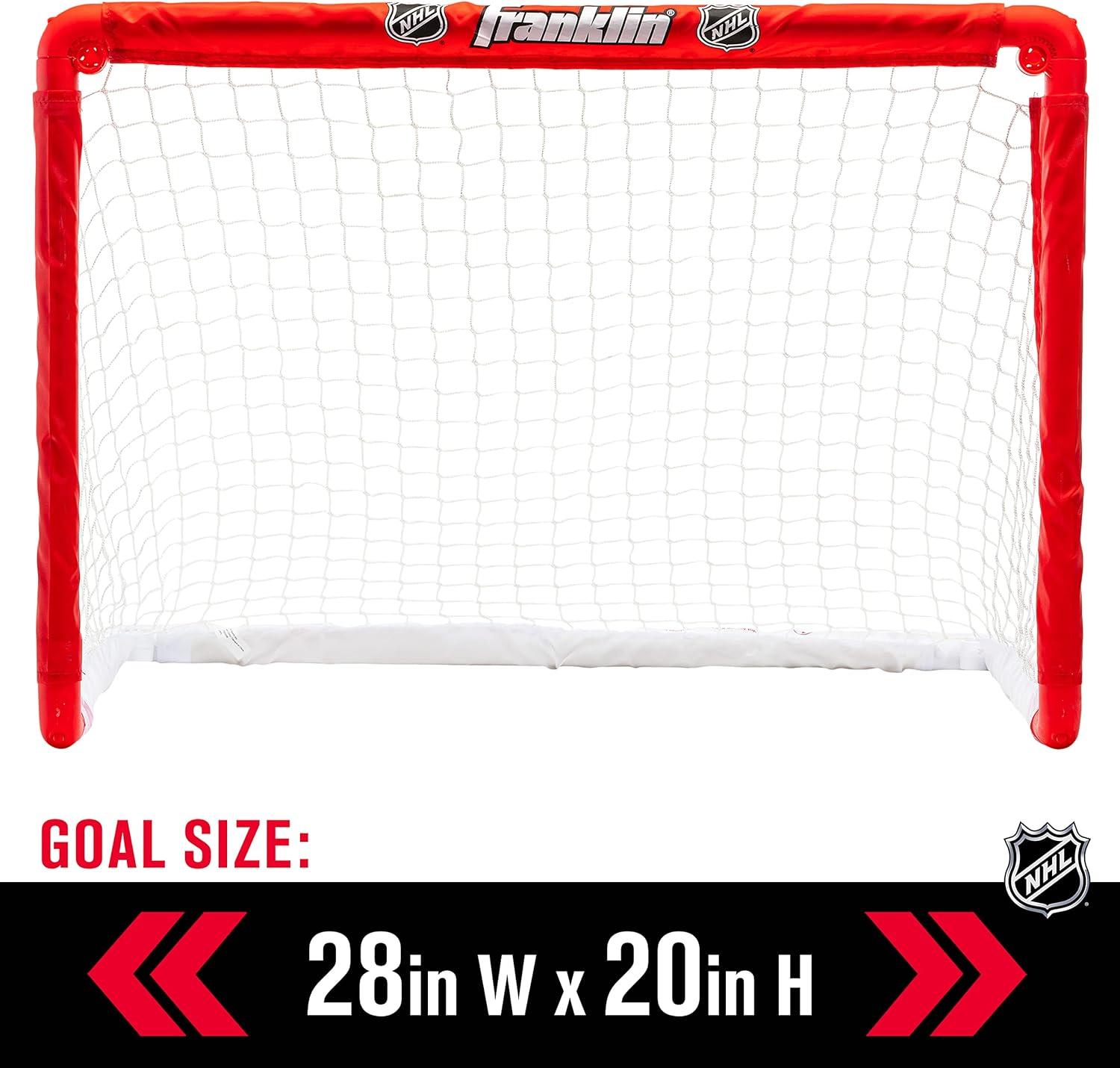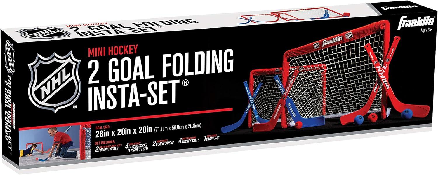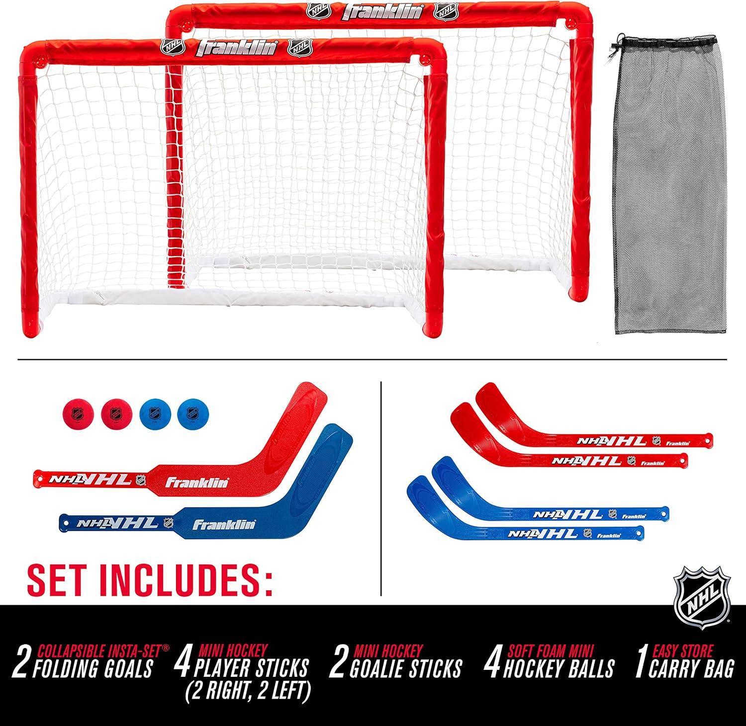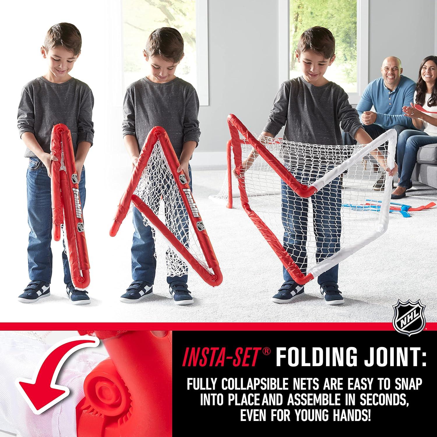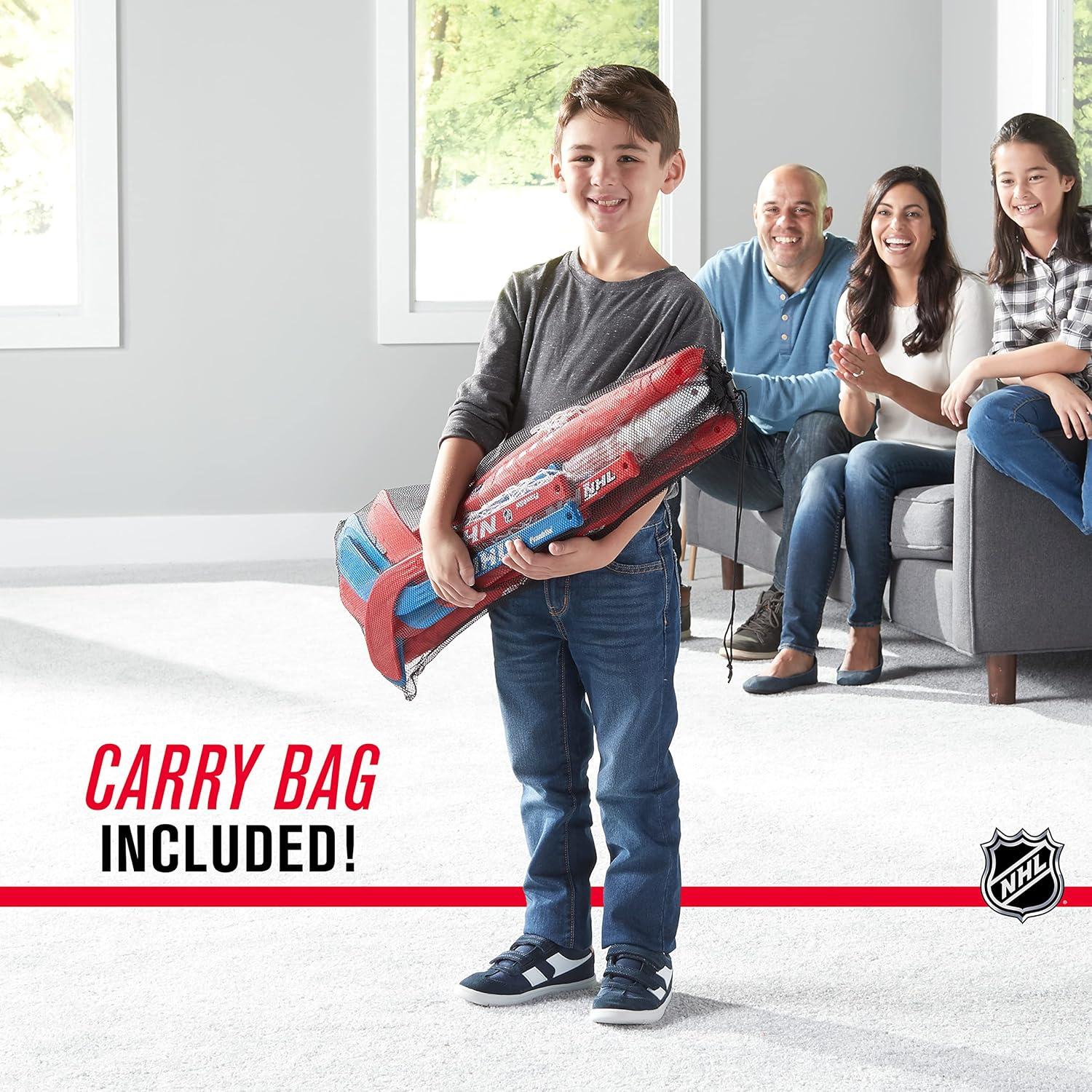 Once you experience the thrilling fun of knee hockey, you’ll be hooked! Franklin Sports is proud to present an indoor hockey set like no other. Durable and long-lasting, yet easy enough to set up and take down, this indoor hockey set is perfect for toddlers and kids alike. With four player hockey sticks and two goalie sticks, you can have hours of fun scoring goals against your opponents! With fully collapsible goals and weatherproof netting, the Franklin Mini Hockey set is your answer to a complete indoor hockey game. Challenge friends or family and see who can score in this fun twist on a traditional hockey game! Nets fold down compactly and are easy enough to snap into place and assemble, even for young hands. Slim carrying bag makes it easy to transport your indoor hockey game set anywhere. Parents, you’ll be glad to know that the set comes with foam hockey balls. The set is durable enough to stand up to regular use and even the most competitive gameplay. Available in red and black, with both right and left-handed player sticks and goalie sticks. Entire set folds away neatly for simple storage when not in use.