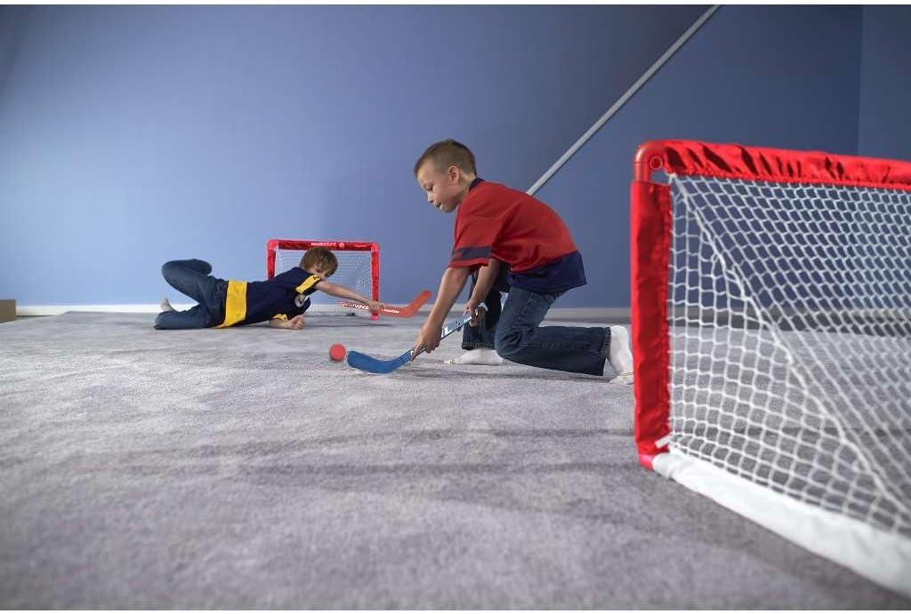 Parents, you’ll be glad to know that the set comes with foam hockey balls, so your windows should be perfectly safe, even if the hockey balls are hit hard! The set is durable enough to stand up to regular use and even the most competitive gameplay. Available in red and black, with both right and left-handed player sticks and goalie sticks. Entire set folds away neatly for simple storage when not in use.