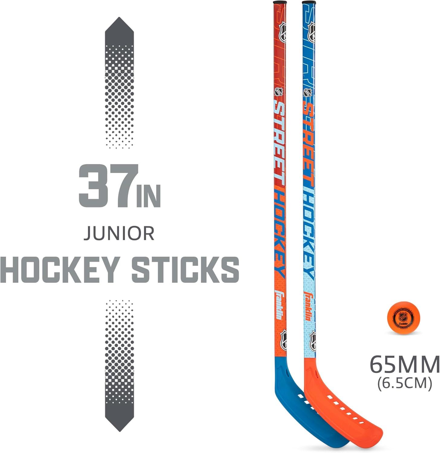 SET INCLUDES: (2) 37inch junior hockey sticks and (1) official size 65mm low density street hockey ball